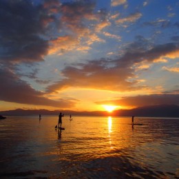 のんびりとプカプカと琵琶湖でクルージングもよし、海で波乗りもよし、SUPレース、SUPで釣り、SUP yogaにエクササイズやダイエットにも最適なスポーツ。